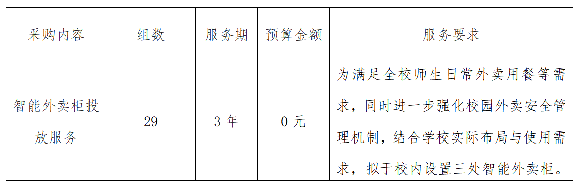 中国地质大学(北京)现就智能外卖柜投放服务进行公开比选,欢迎符合条件的潜在服务商积极参与比选。