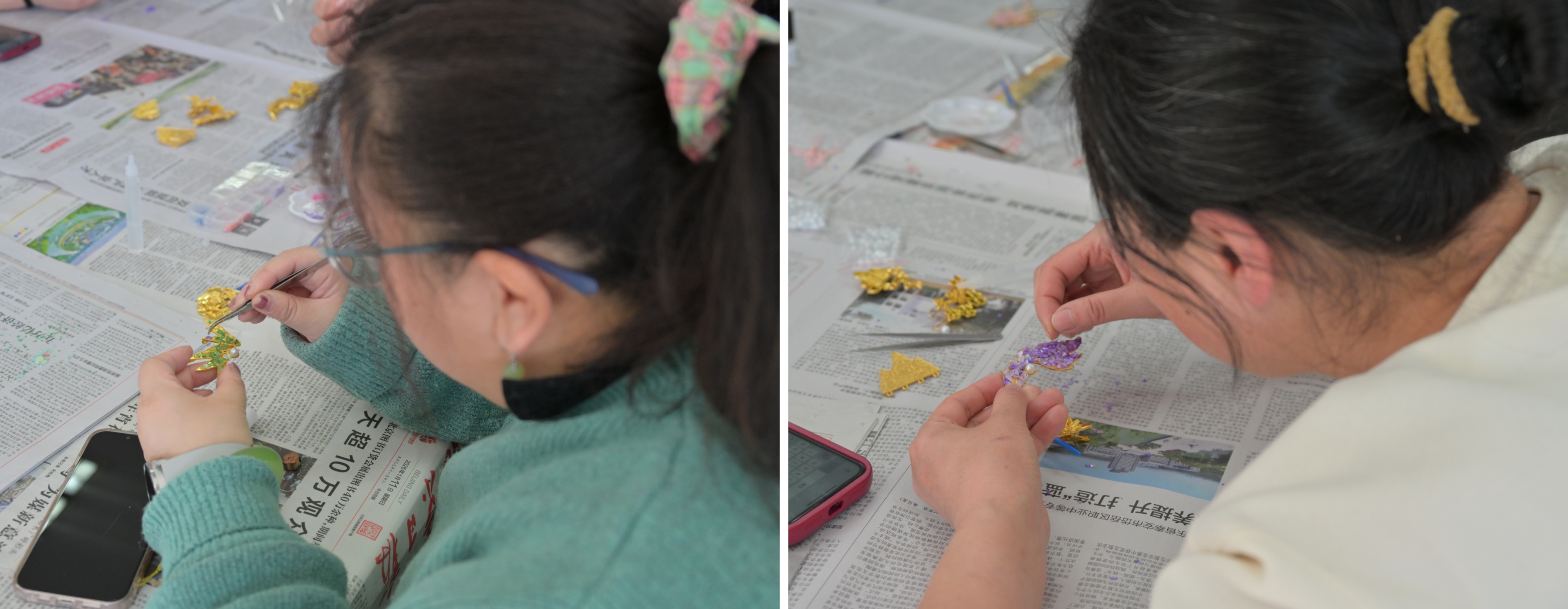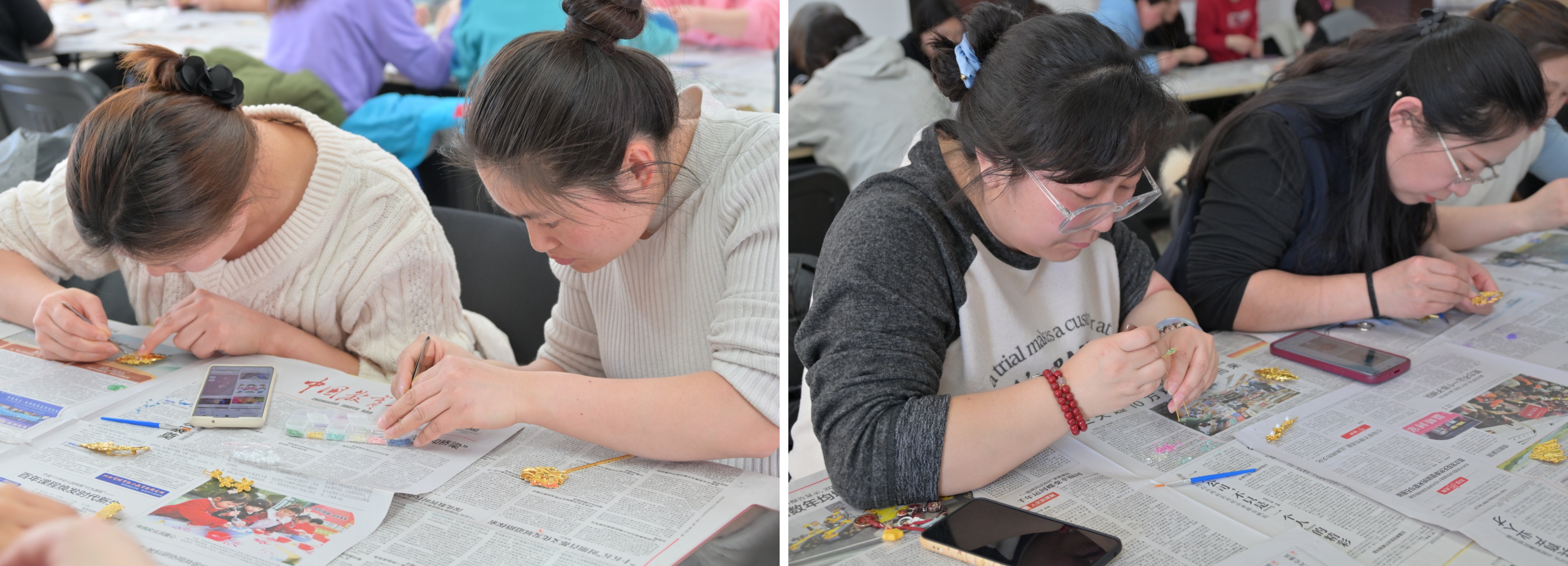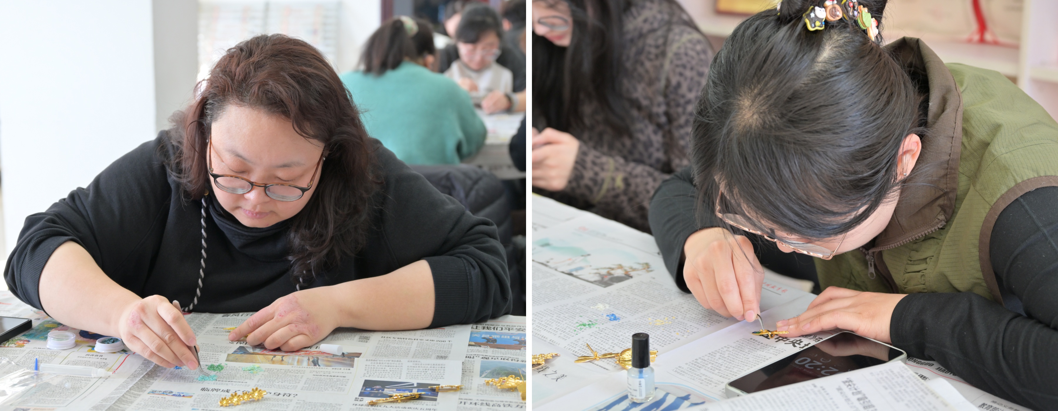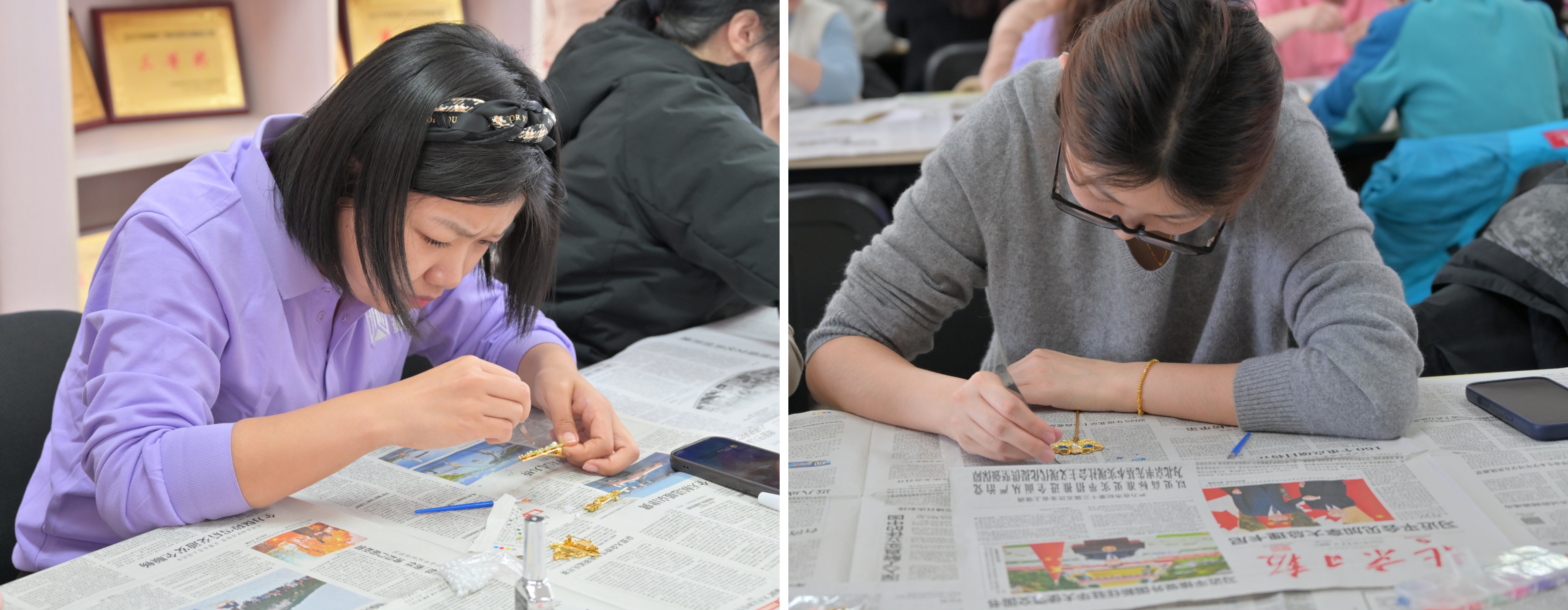 在实操环节,大家围坐一堂,从选材、设计到粘贴、封层,一步步沉浸于手工创作的乐趣之中。原本朴素的发簪、胸针,在一双双巧手下焕发出璀璨光彩。