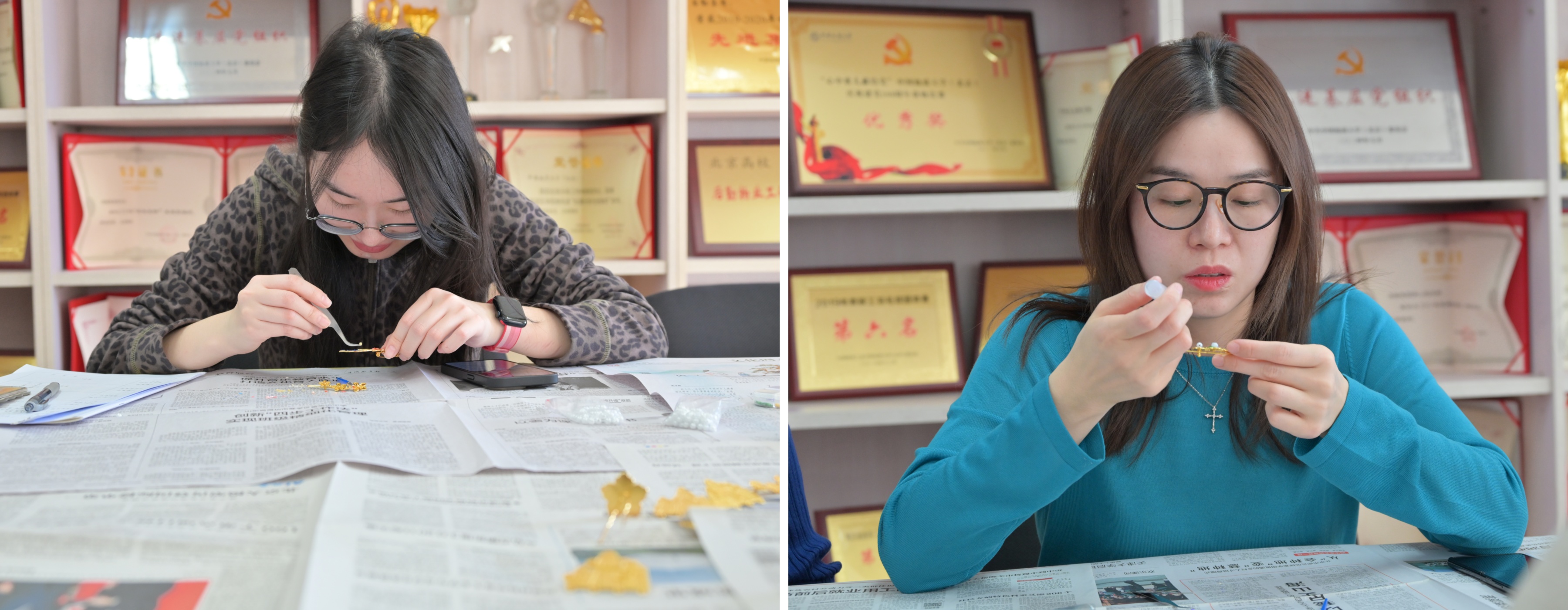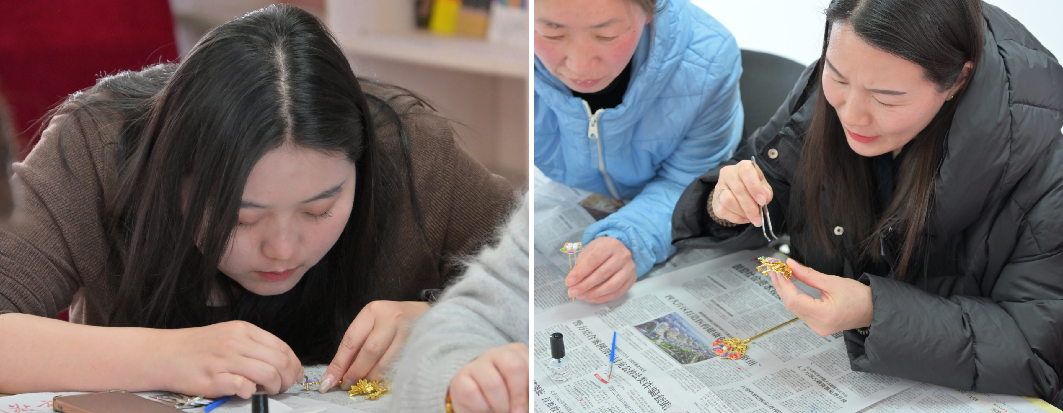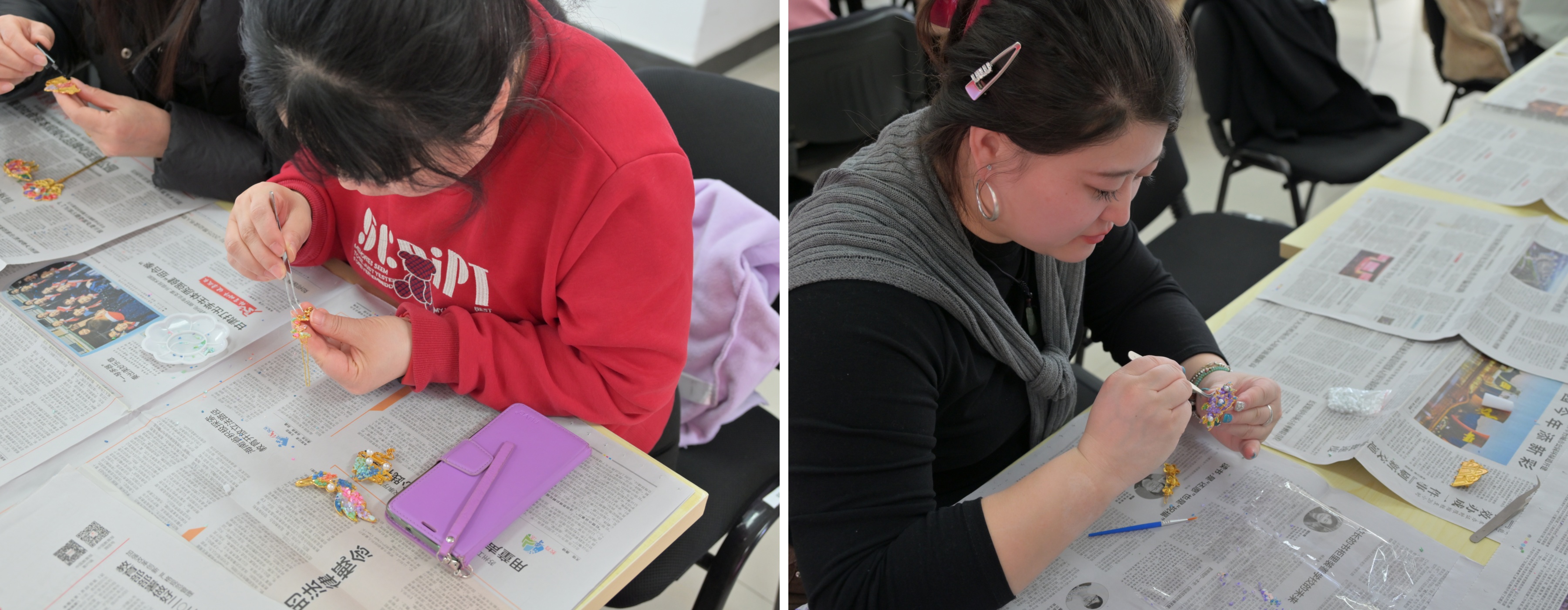 在实操环节,大家围坐一堂,从选材、设计到粘贴、封层,一步步沉浸于手工创作的乐趣之中。原本朴素的发簪、胸针,在一双双巧手下焕发出璀璨光彩。