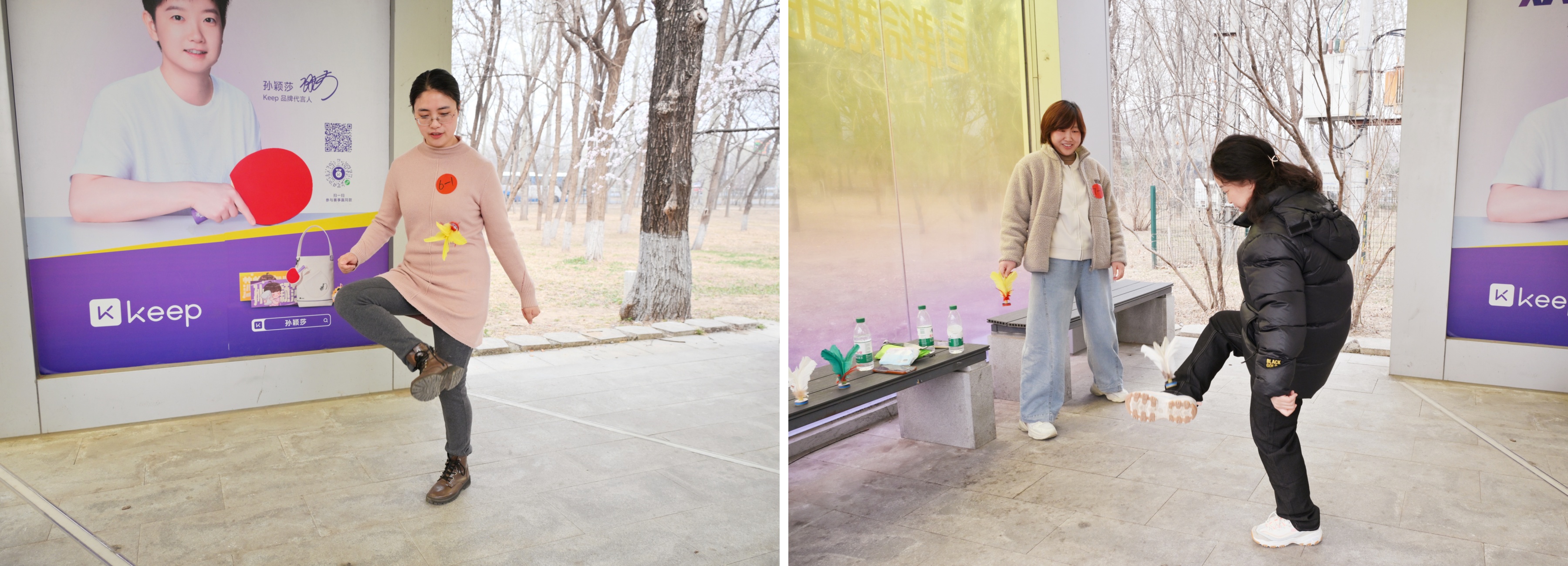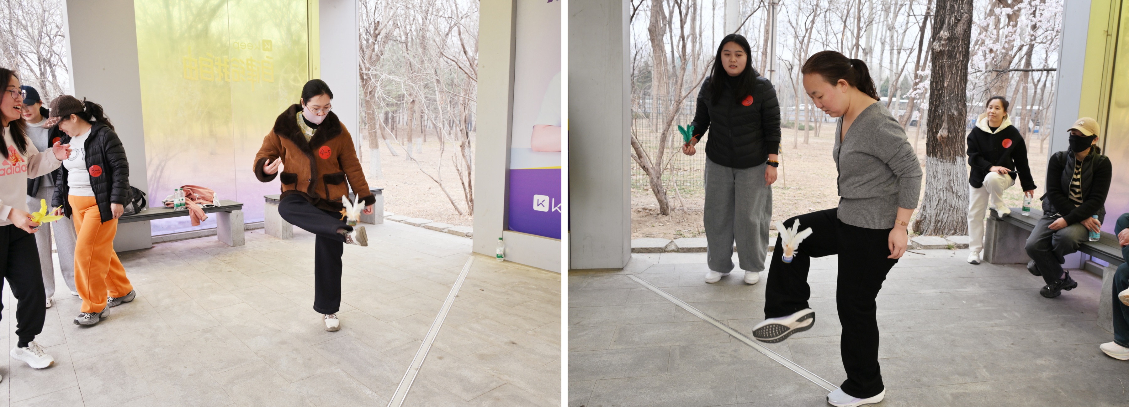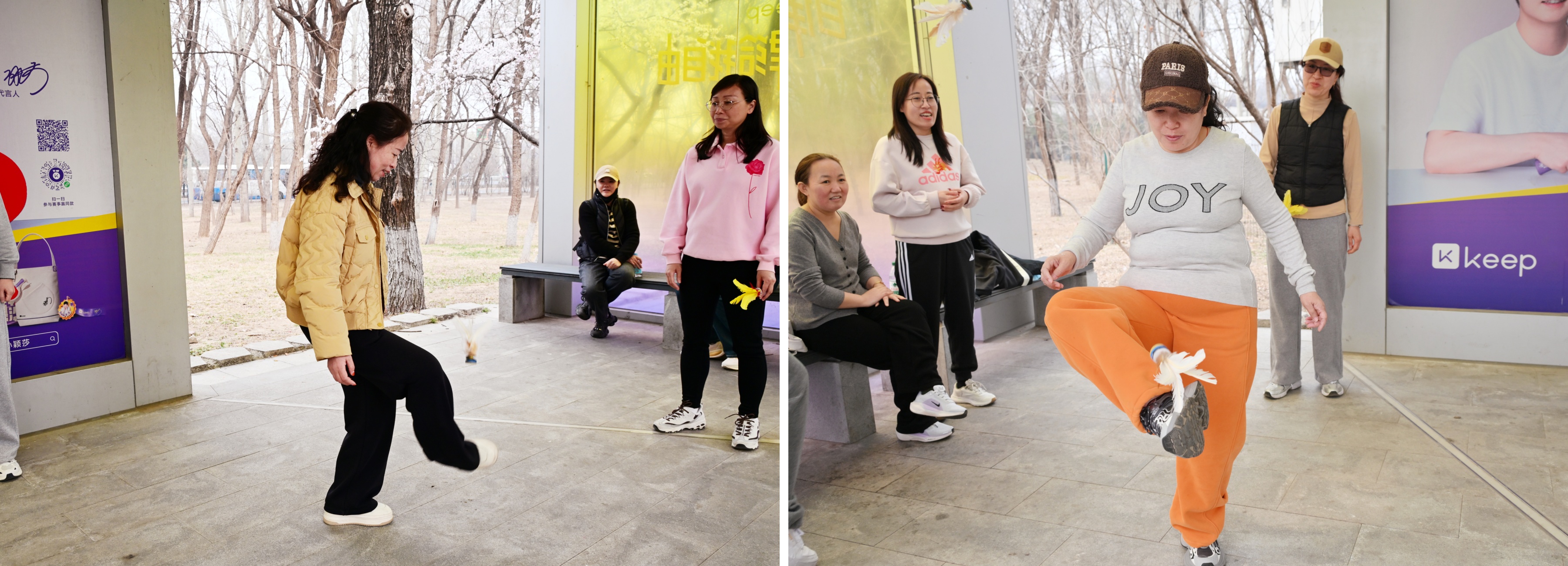 “接力踢毽子”中,毽子在脚尖轻盈翻飞,每一下都凝聚着默契与坚持,赢得阵阵喝彩。